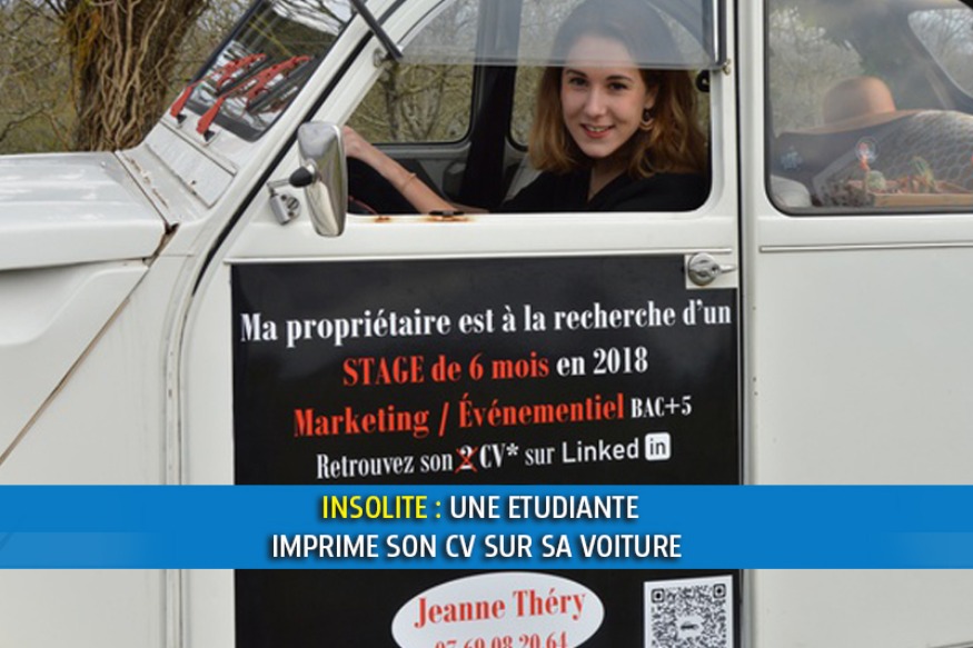 La jeune fille a fait imprimer son CV sur sa voiture.