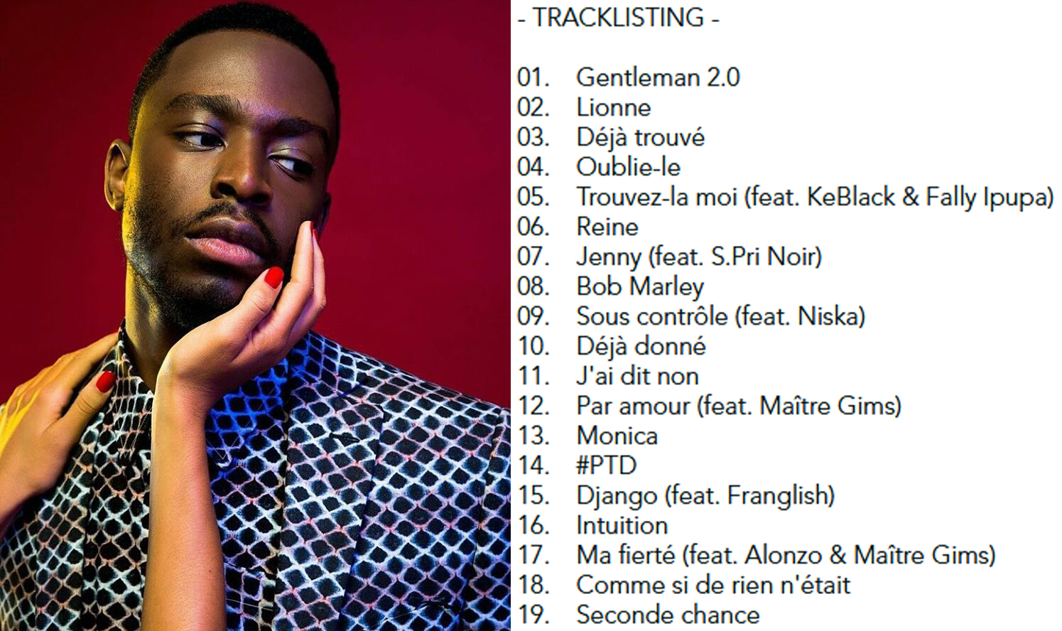 Dadju rend l'attente un peu moins difficile pour ses fans. Après avoir dévoilé ''Reine'', ''déjà trouvé'' et ''ma fierté'', trois titres extraits de son prochain album, l'artiste vient de lâcher la tracklist de ce dernier. Pas moins de dix-neuf (19) titres figurent sur Gentleman 2.0 dont la sortie officielle est prévue pour ce 24 novembre. On pourra y retrouver '' trouvez la moi'', titre en feat avec Fally Ipupa et Keblack, ainsi qu'une collaboration avec Niska pour le titre ''sous contrôle''. Maitre Gim's, Glishman et Sprinoir sont également les autres stars qui ont participé à cet album qui comporte un titre en hommage à Bob Marley.