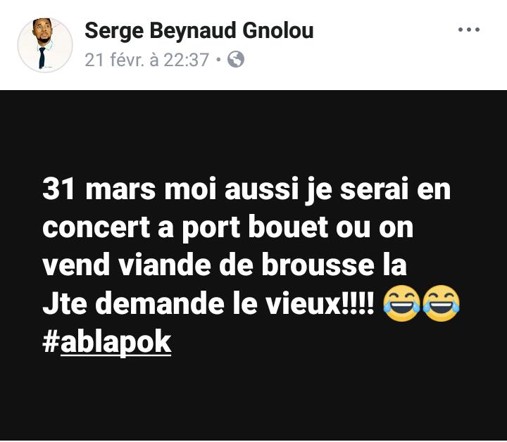 Il n’en fallait pas moins pour que Serges Beynaud s’en mêle et annonce lui aussi un évènement le même jour : ‘’31 mars moi aussi je serais en concert à Port Bouet ou on vend viande de brousse là’’