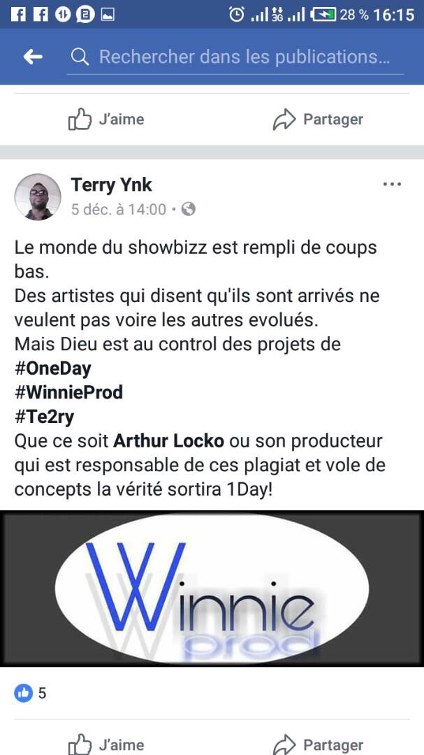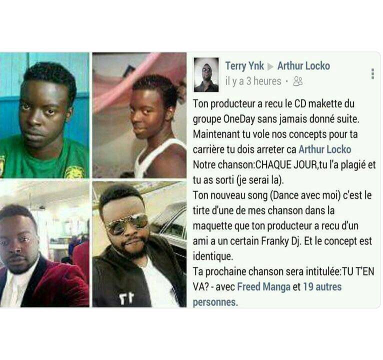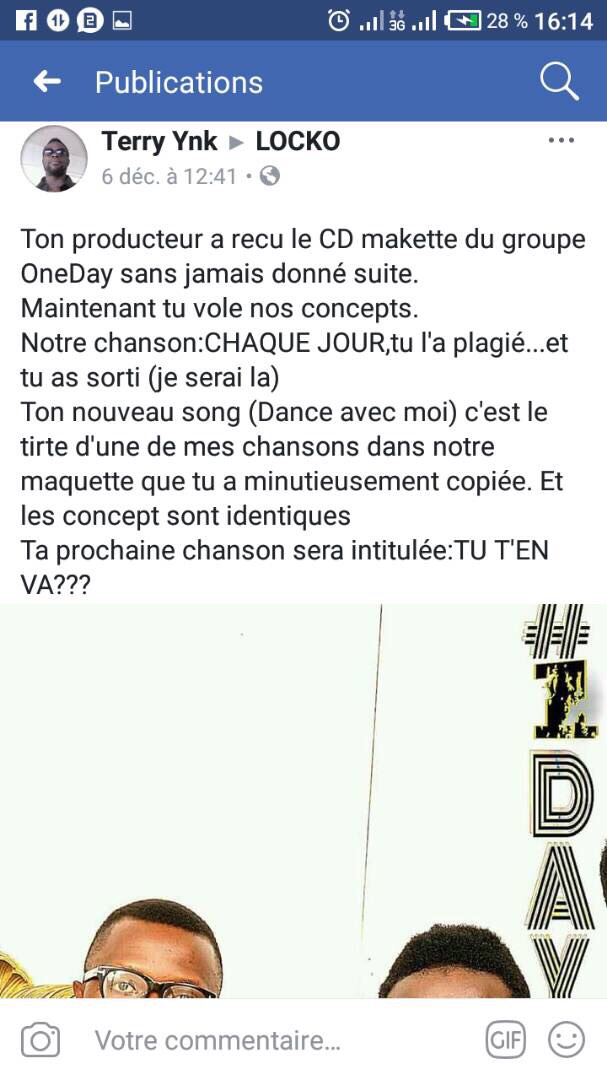 L'accusateur explique qu'il a contacté le producteur de Locko a qui il aurait remis la maquette de son groupe ONE DAY et celui-ci n'aurait pas donné suite. Grande fût leur surprise lorsqu'ils ont constaté que leurs titres étaient peu à peu chantés par Locko. Dans un post où il identifie Locko, il déclare : ''Maintenant tu voles nos concepts. Notre chanson "Chaque jour", tu l'as plagiée et tu as sorti "Je serais la". Ton nouveau son "Dance avec moi" c'est le titre d'une de mes chansons dans notre maquette que tu as minutieusement copiée. Et les concepts sont identiques Ta prochaine chanson sera intitulée: TU T'EN VA???''