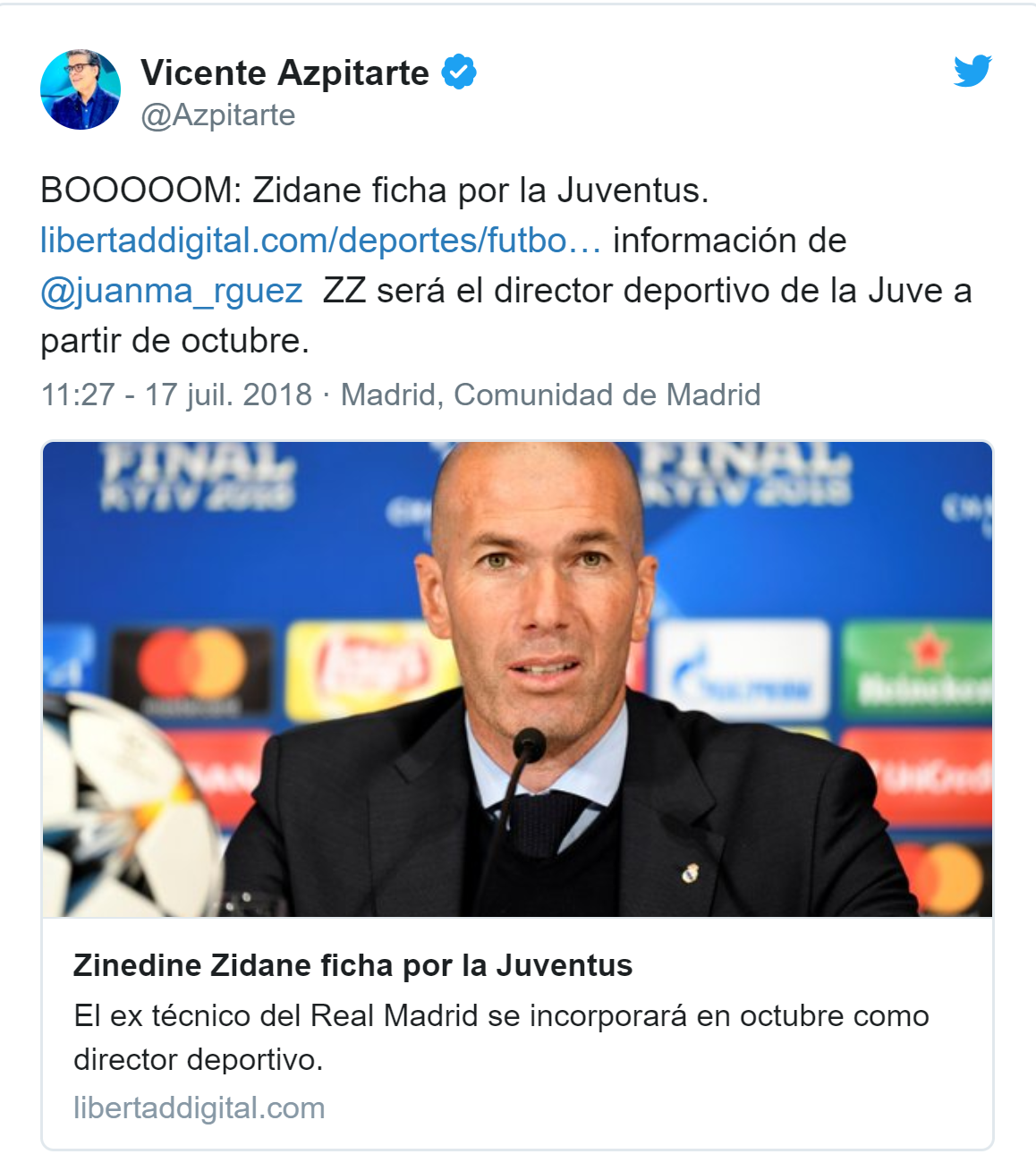 Selon le média espagnol Libertad Digital, Zinédine Zidane rejoindra la Juventus Turin à partir d’octobre 2018 en tant que conseiller de la direction sportive. Des sources proches de la famille Agnelli auraient confirmé la nouvelle.