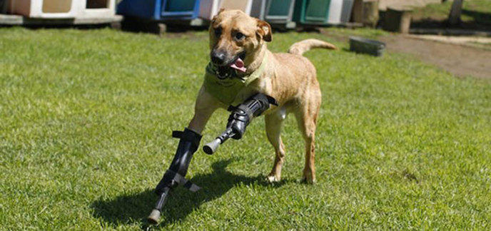 Avec ses prothèses en carbone, le chien peut désormais marcher et courir comme le font tous les animaux. Et son maître n'hésite à soumettre l'animal a toutes sorte d'exercices physique pour lui faire retrouver ses réflexes!