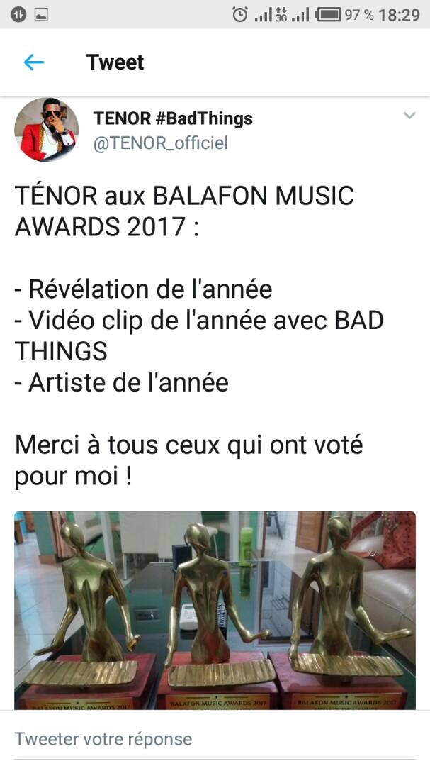 L'année 2017 aura décidément été une saison fructueuse pour le jeune rappeur camerounais de 19ans. Après sa signature historique avec le goupe Universal Music Africa et l'achat d'une grosse cylindrée, TENOR a été récompensé dans la soirée du mercredi 13 décembre aux Balafon Music Awards.