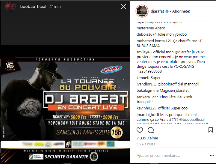 Il a ainsi posté sur sa page Instagram un screenshot fait depuis la page officiel du rappeur Booba affichant le visuel de son concert du 31 mars prochain. Arafat à légendé la publication en ces termes #swagamatta @boobaofficiel à validé, comme pour montrer l’importance de l’événement.