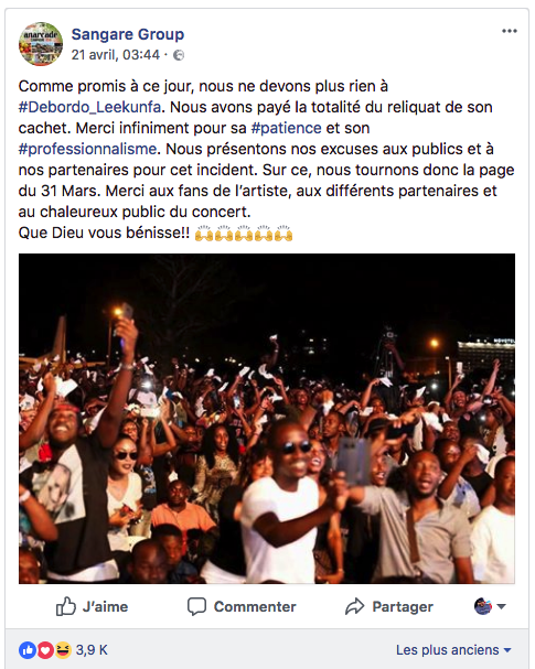 Mais fort heureusement le promoteur aurait fini par tenir ses promesses, à en croire le message posté sur son mur facebook e 21 Avril dernier: