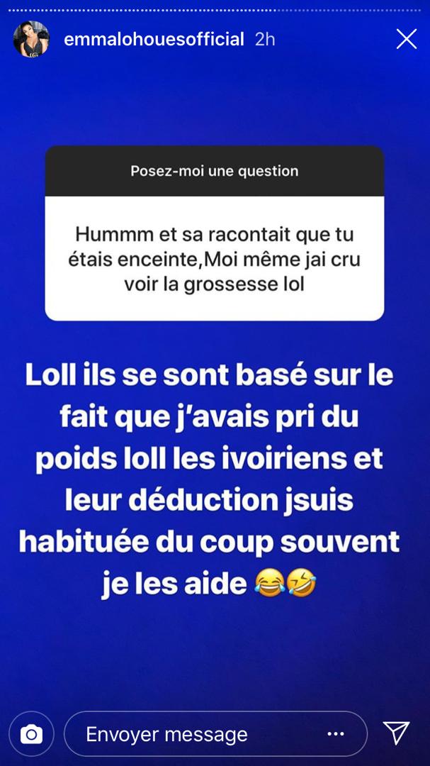 Alors qu’on lui collait une prétendue grossesse, Emma Lohoues n’a fait aucun commentaire et laissé les gens aller dans leurs spéculations. Seulement se prêtant au jeu du ‘’questions-réponses’’ sur Instagram, l’actrice répondant à la préoccupation d’un internaute a déclaré « Ils se sont basés sur le fait que j’avais pris du poids lol les Ivoiriens et leur déduction je suis habituée du coup souvent je les aide »