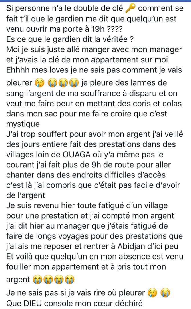 La désormais chanteuse explique que c’est en son absence que les malfrats auraient pénétré dans sa chambre d’hôtel, pris l’argent et le remplacer par du sable, des colas et des cauris pour lui faire croire à une œuvre mystique.