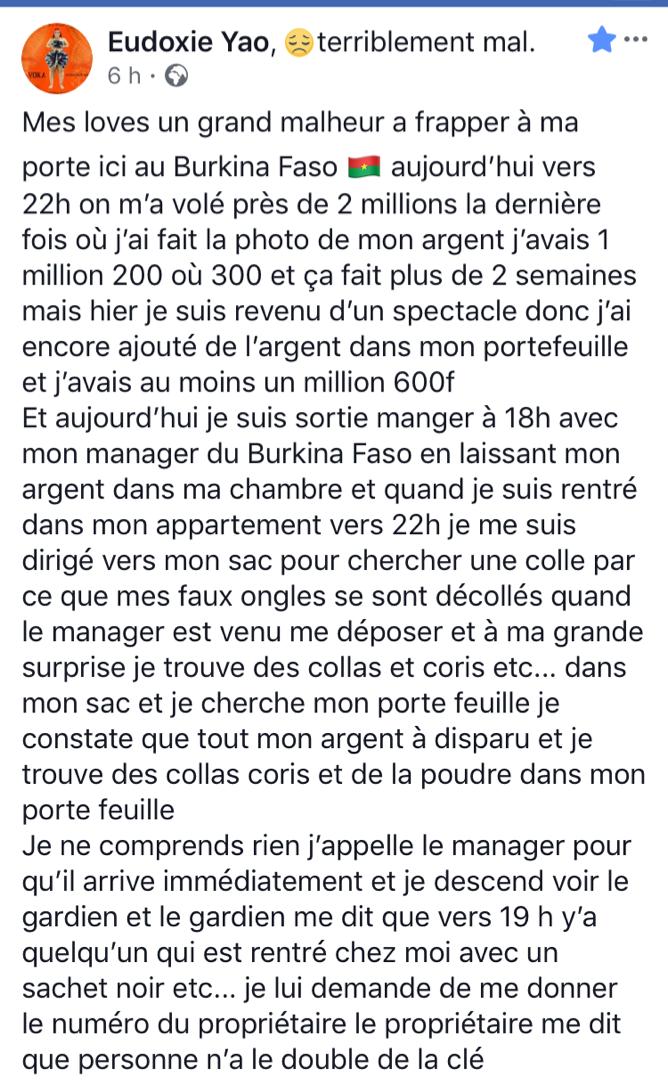 En tournée depuis plusieurs semaines au pays de l’homme intègre, voici qu’un malheur est arrivé à la « Go Bobaraba ». Eudoxie Yao a annoncé dans un post sur Facebook avoir été cambriolé et dépouillé de près de 2 millions de FCFA au Burkina Faso.